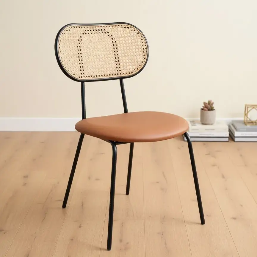גב הכיסא עשוי רטאן חום טבעי, בעוד רגלי הכיסא עשויות מתכת בצבע שחור, המוסיף לעיצוב המיוחד.