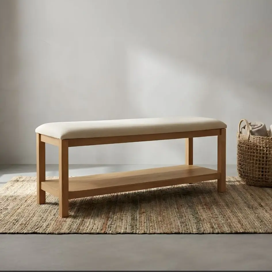ספסל עשוי מעץ, מרופד בד בצבע טבעי