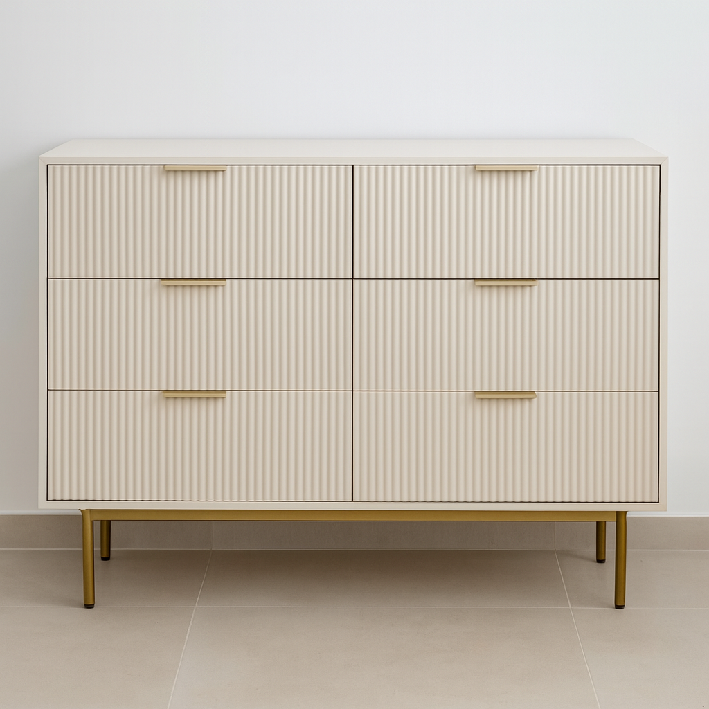 קומודה מעוצבת בגימור לבן נקי, עם דוגמת פסים אופקית על גבי המגירות שמוסיפה עומק ועניין ויזואלי.