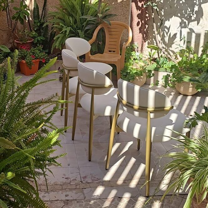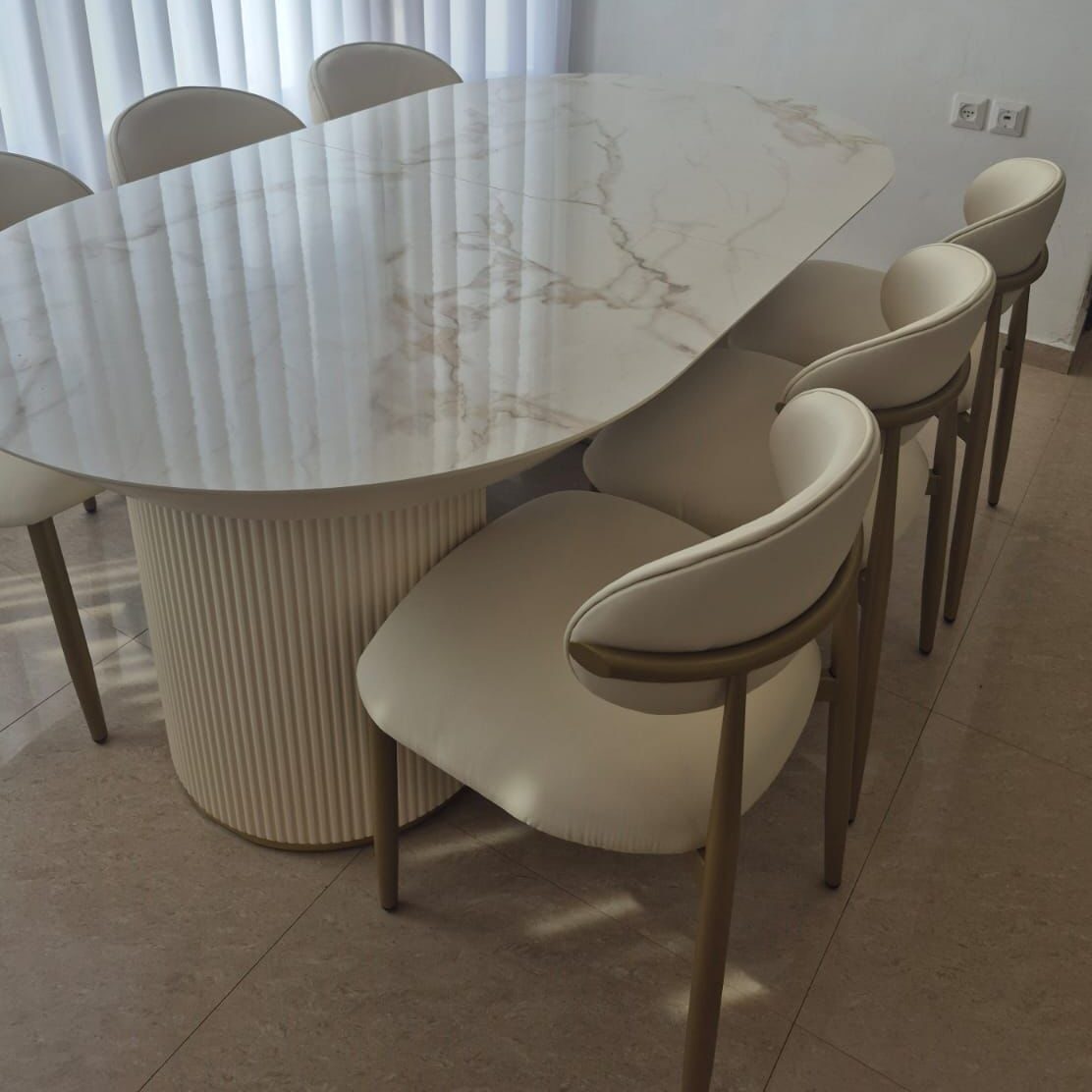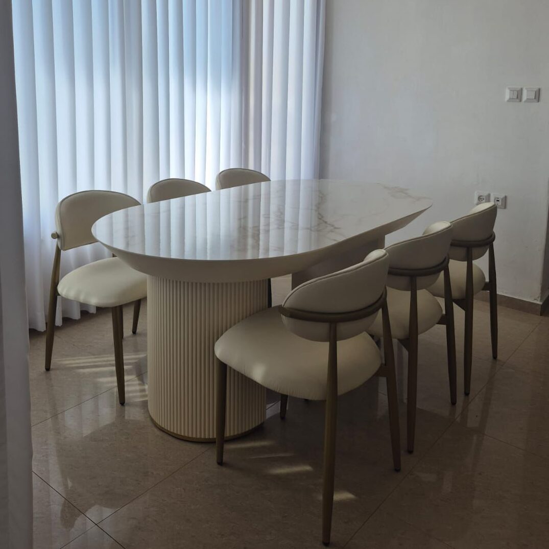 סביב השולחן שישה כיסאות מרופדים בגוון שמנת עם רגליים בגימור מתכת בצבע זהב, המתמזגים בהרמוניה עם השולחן. (ניתן לקבל את רגלי הכיסא גם בצבע שחור)