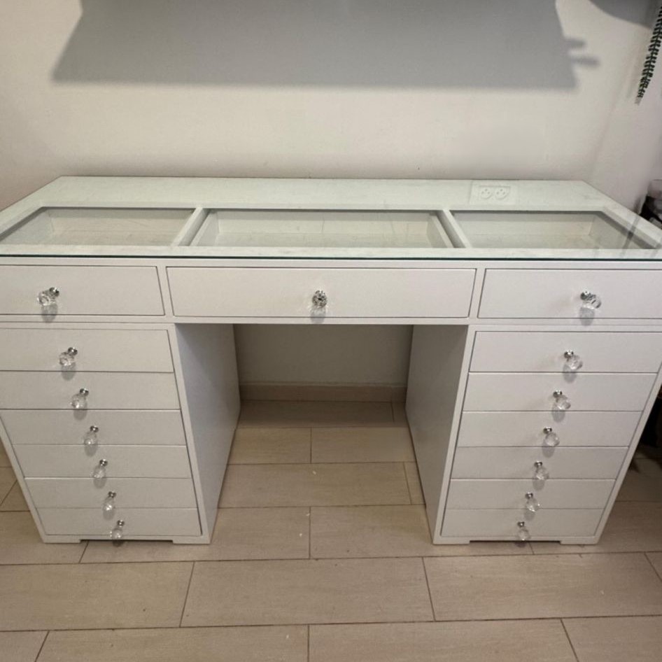 משטח השולחן מחולק לתאים לאחסון מרבי של איפור/תכשיטים ועליו משטח זכוכית