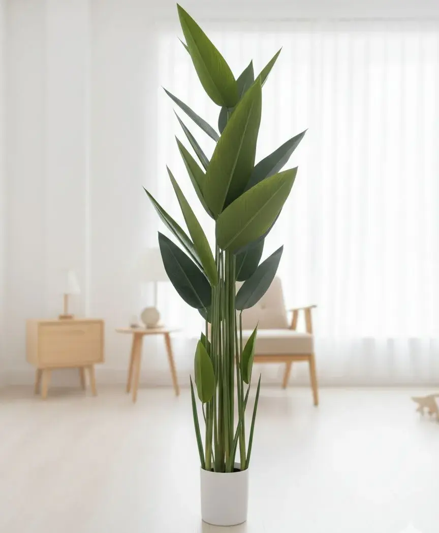 עציץ מלאכותי מרשים בעיצוב דמוי עץ בננה , עם עלים ירוקים עשירים וגזע במראה טבעי למראה ריאליסטי במיוחד.