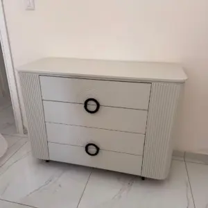 קומודה מעוצבת בצבע לבן עם שילוב זכוכית שקופה