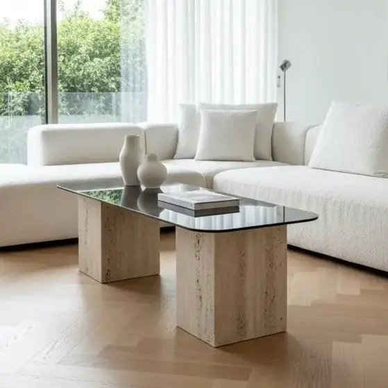 שולחן סלון מרשים עם משטח עליון מזכוכית מחוסמת בגוון מושחר עם פינות מעוגלות, המונח על רגלי קובייה עשויות שיש טרוונטין אמיתי.